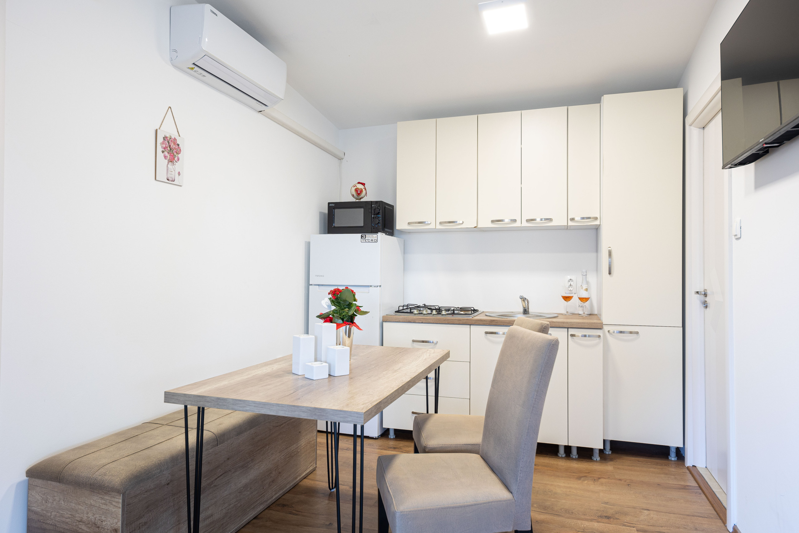 The mobile house comfortably accommodates up to 4 guests, featuring 2 bedrooms with a mix of queen-size and individual beds. Enjoy modern amenities including air conditioning, WiFi, and two smart TVs to ensure a comfortable and connected stay. The fully equipped American-style kitchen allows for convenient meal preparation, while the dining area provides a perfect space for shared meals.